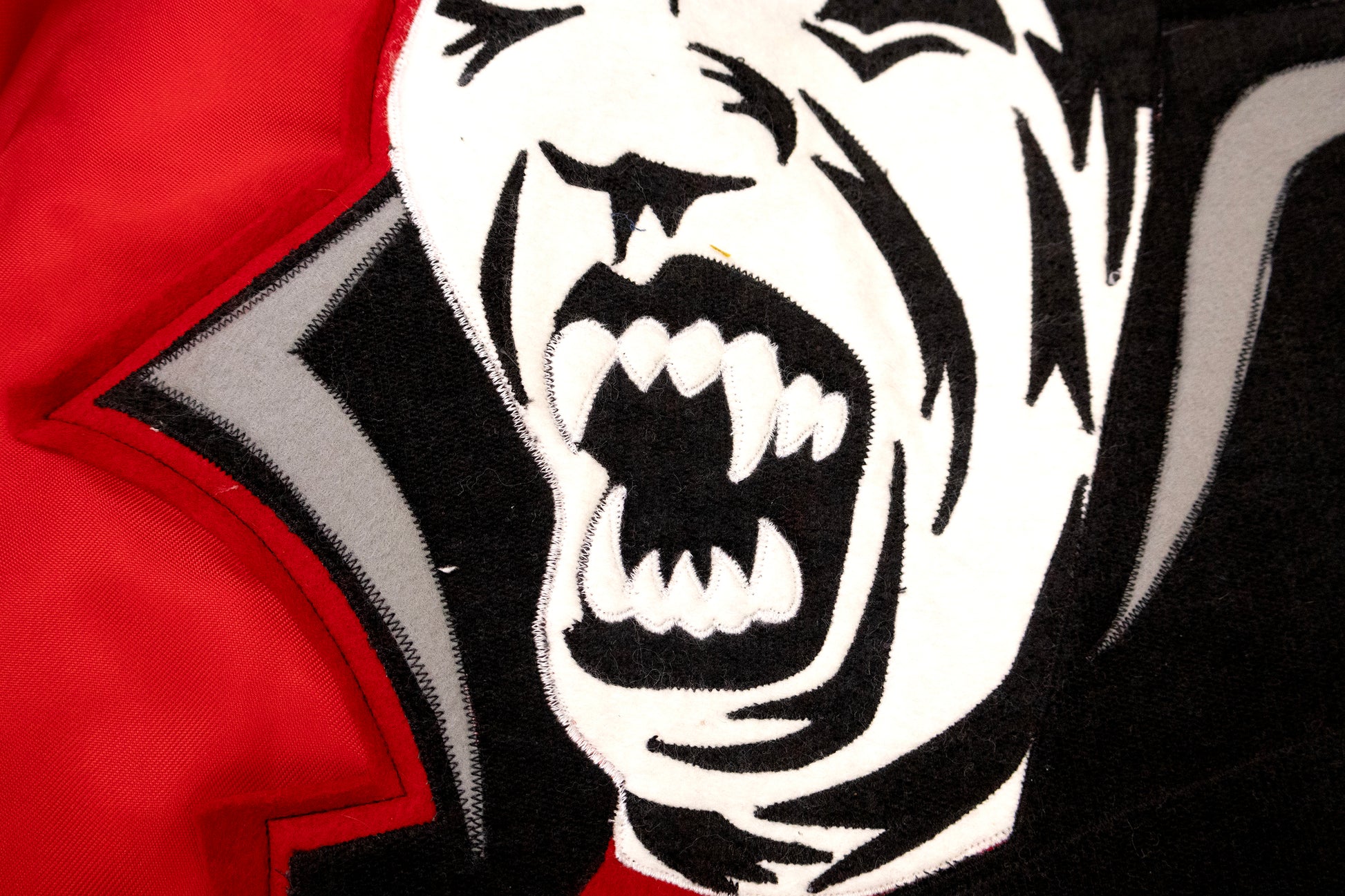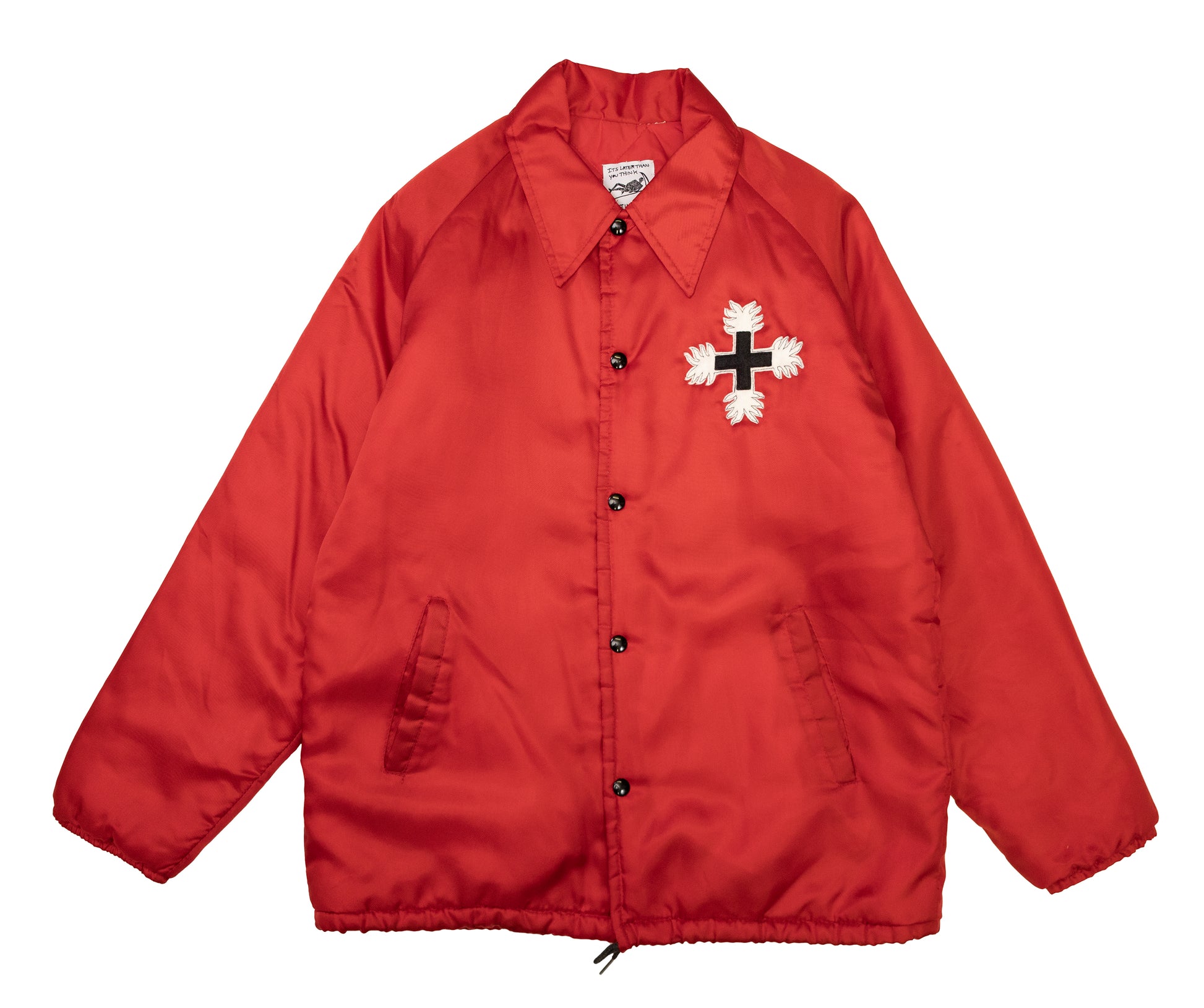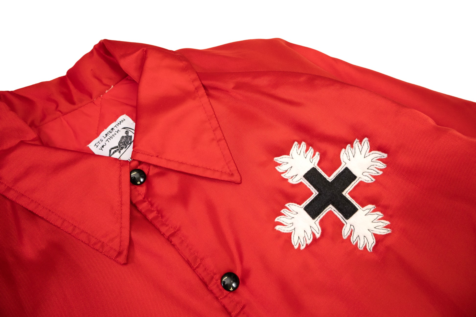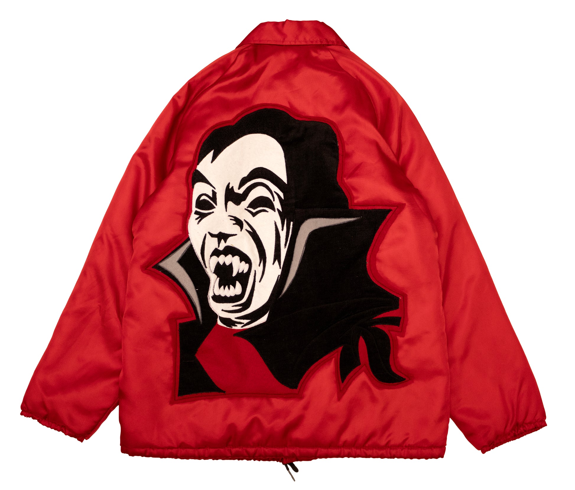 vintage 70s red nylon windbreaker. quilted lining. raglan sleeves. hand cut and pieced felt appliqué of vampire face and the crest for the order of the dragon. fits like a medium.