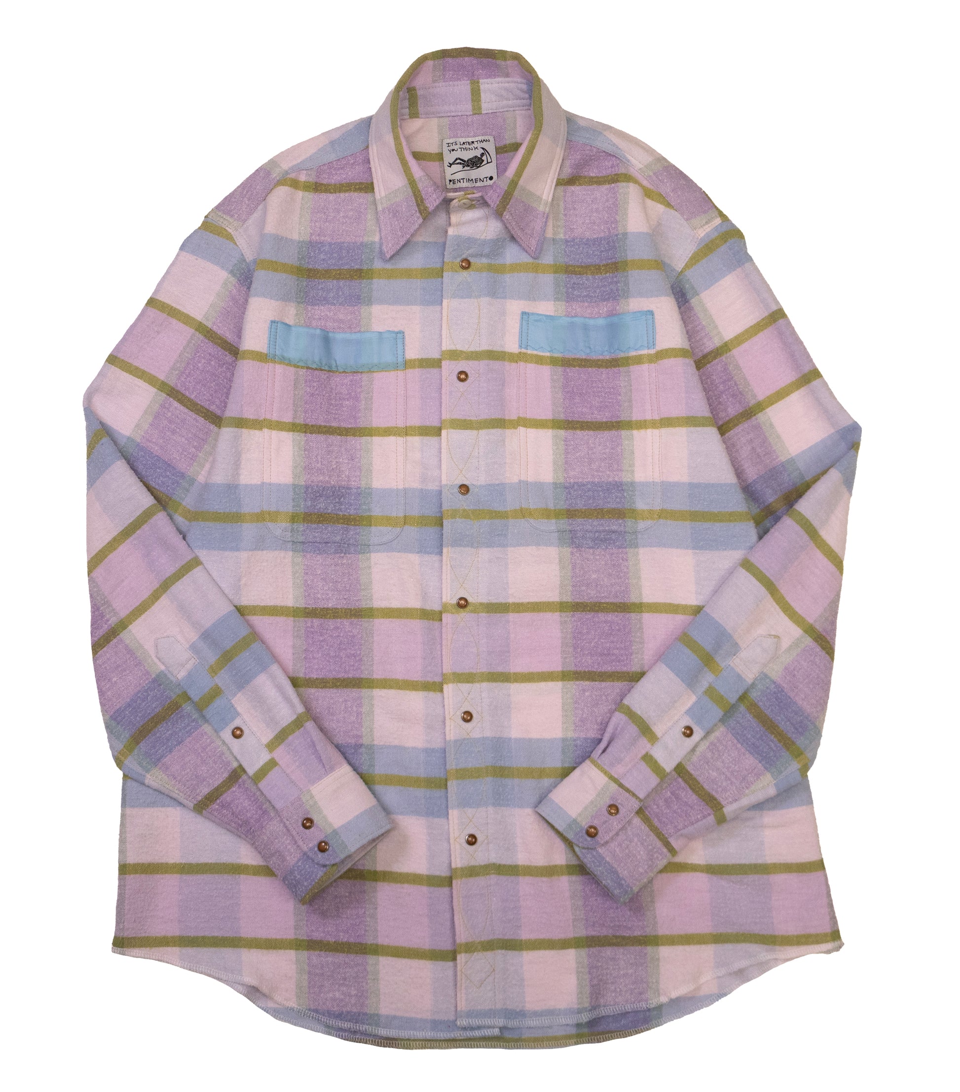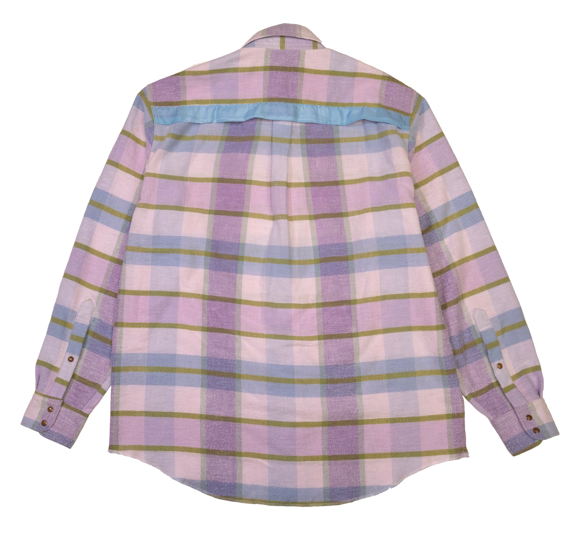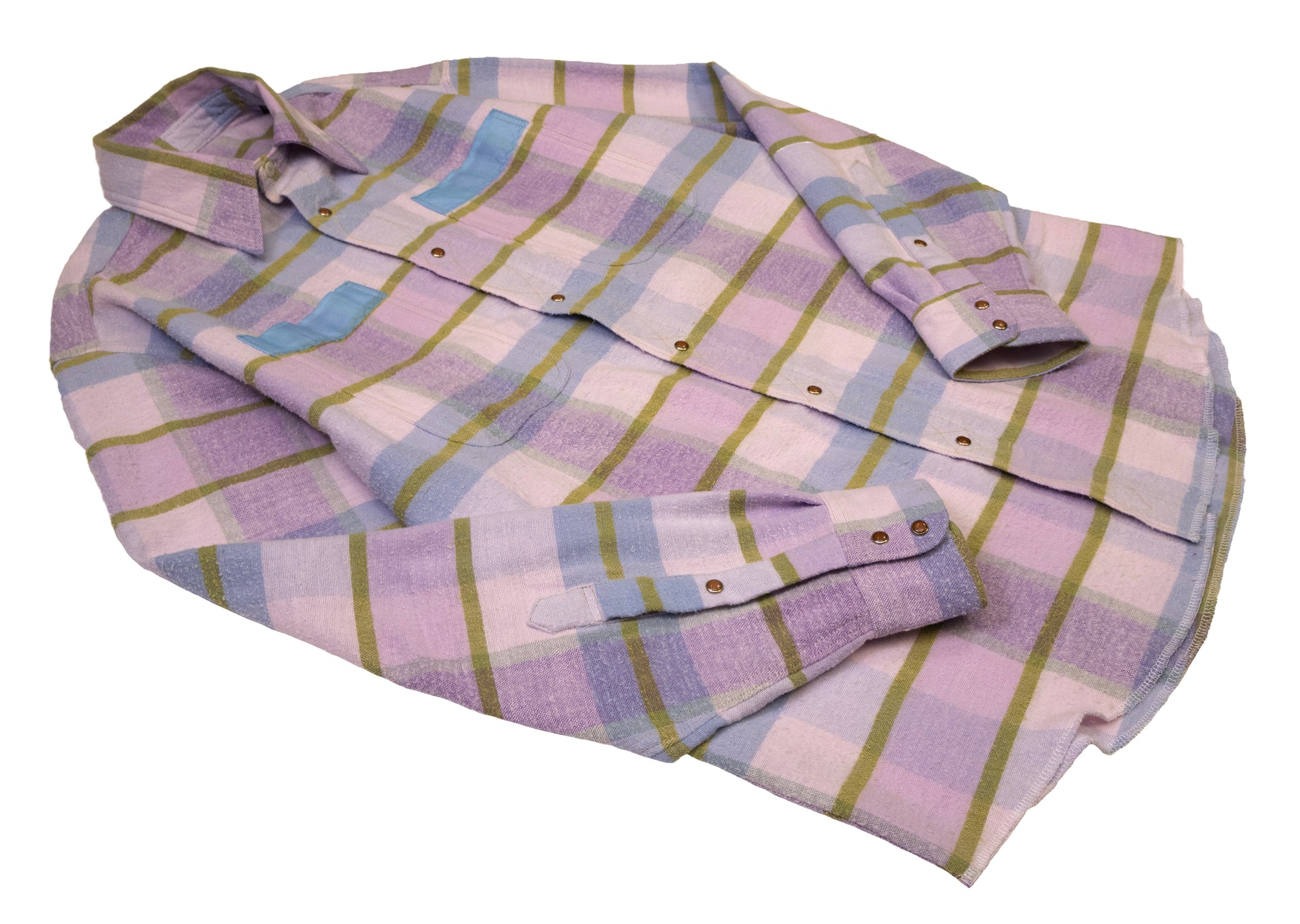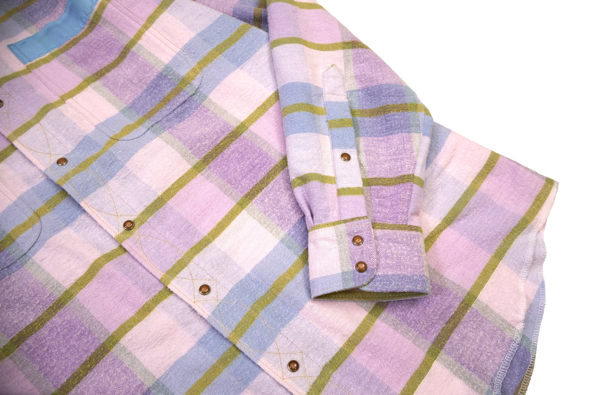vintage plaid bed spread with years of wear, pilling, and threadbare spots. original binding used on the trim of the pockets and yoke. western top stitching detail on the button placket. vintage western snaps. fits like a large.