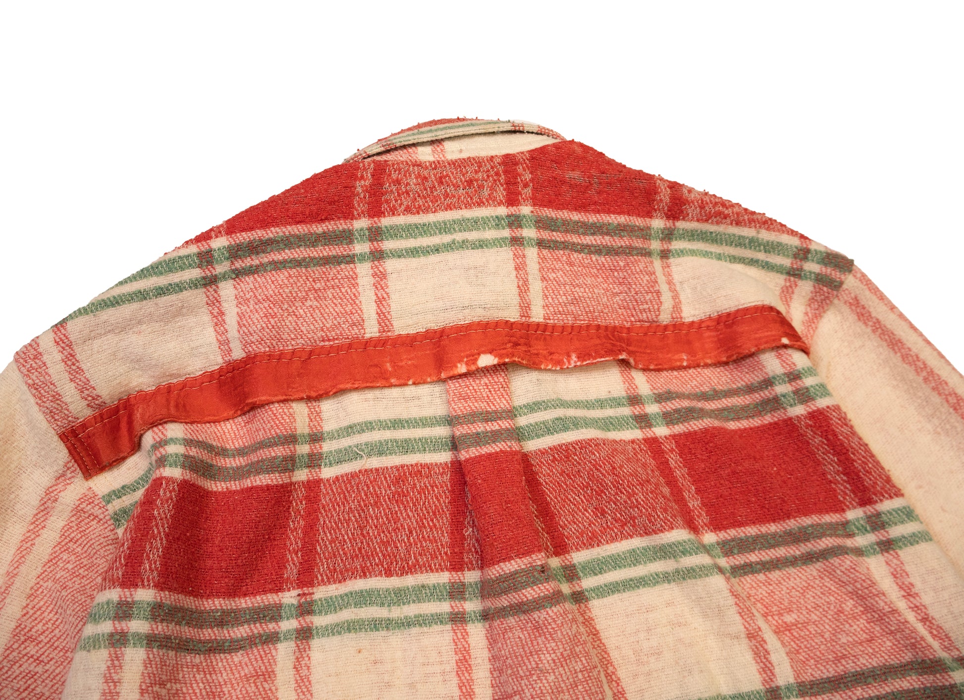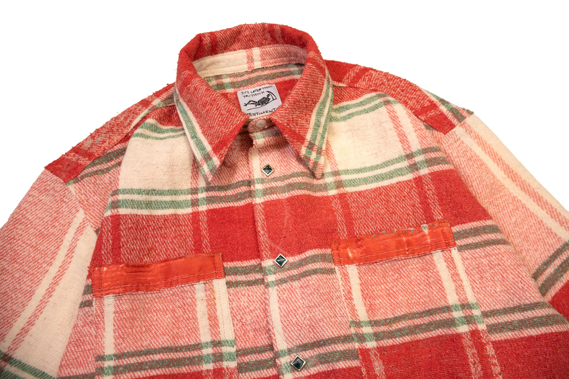 vintage plaid bed spread with years of wear, pilling, and threadbare spots. original binding used on the trim of the pockets and yoke. western top stitching detail on the button placket. vintage western snaps.