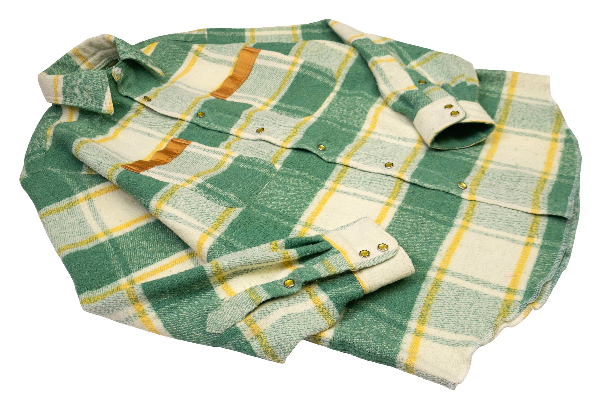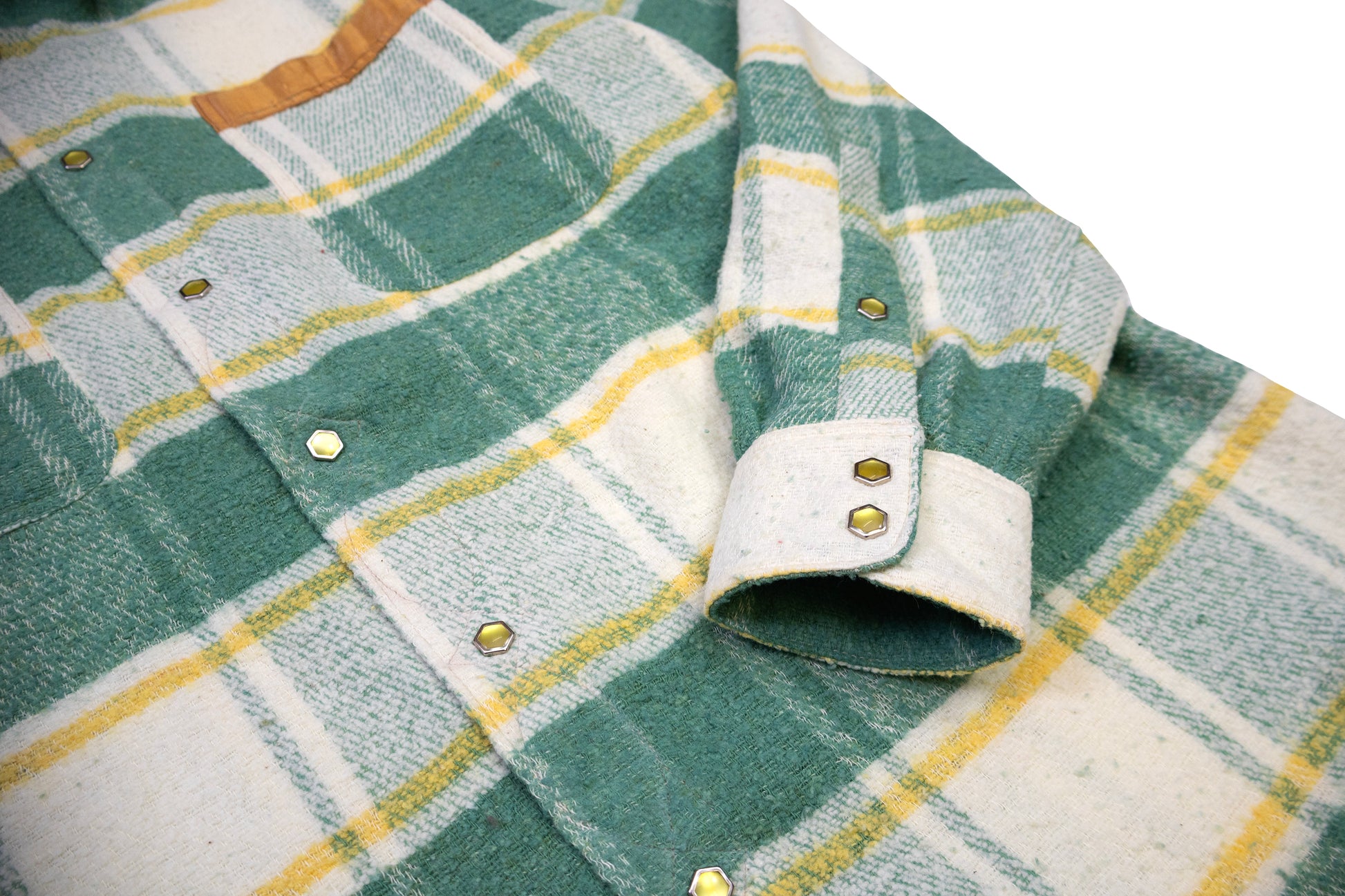 vintage plaid bed spread with years of wear, pilling, and threadbare spots. original binding used on the trim of the pockets and yoke. western top stitching detail on the button placket. vintage western snaps. fits like a large.