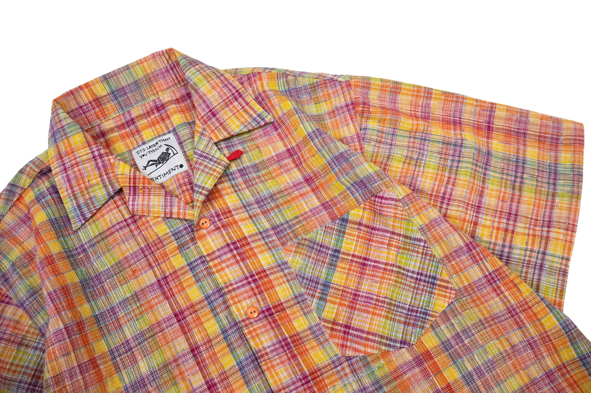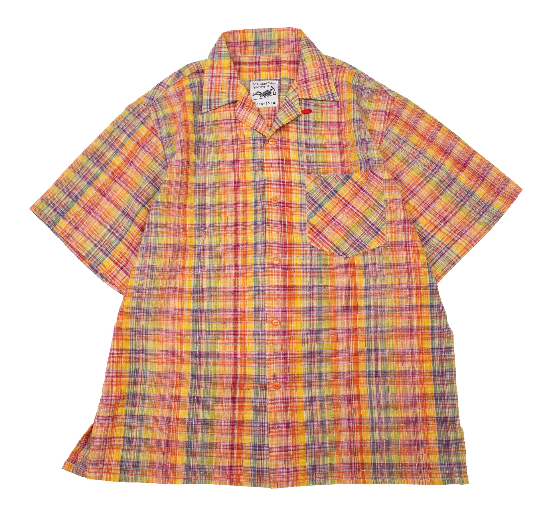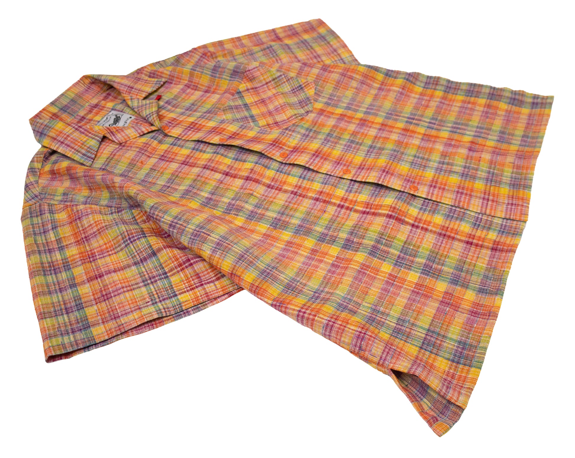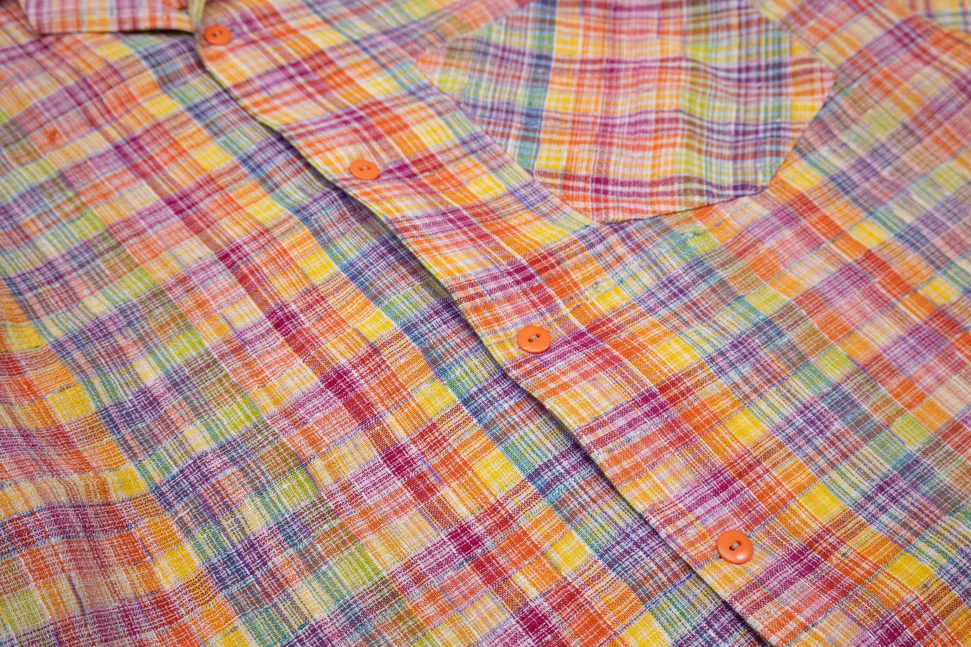 vintage cotton gauze. bright orange plaid. loop collar. split tails. vintage buttons. fits like a large.