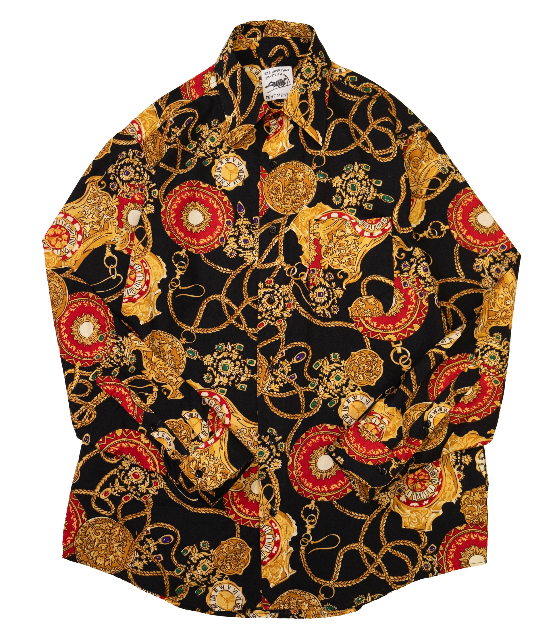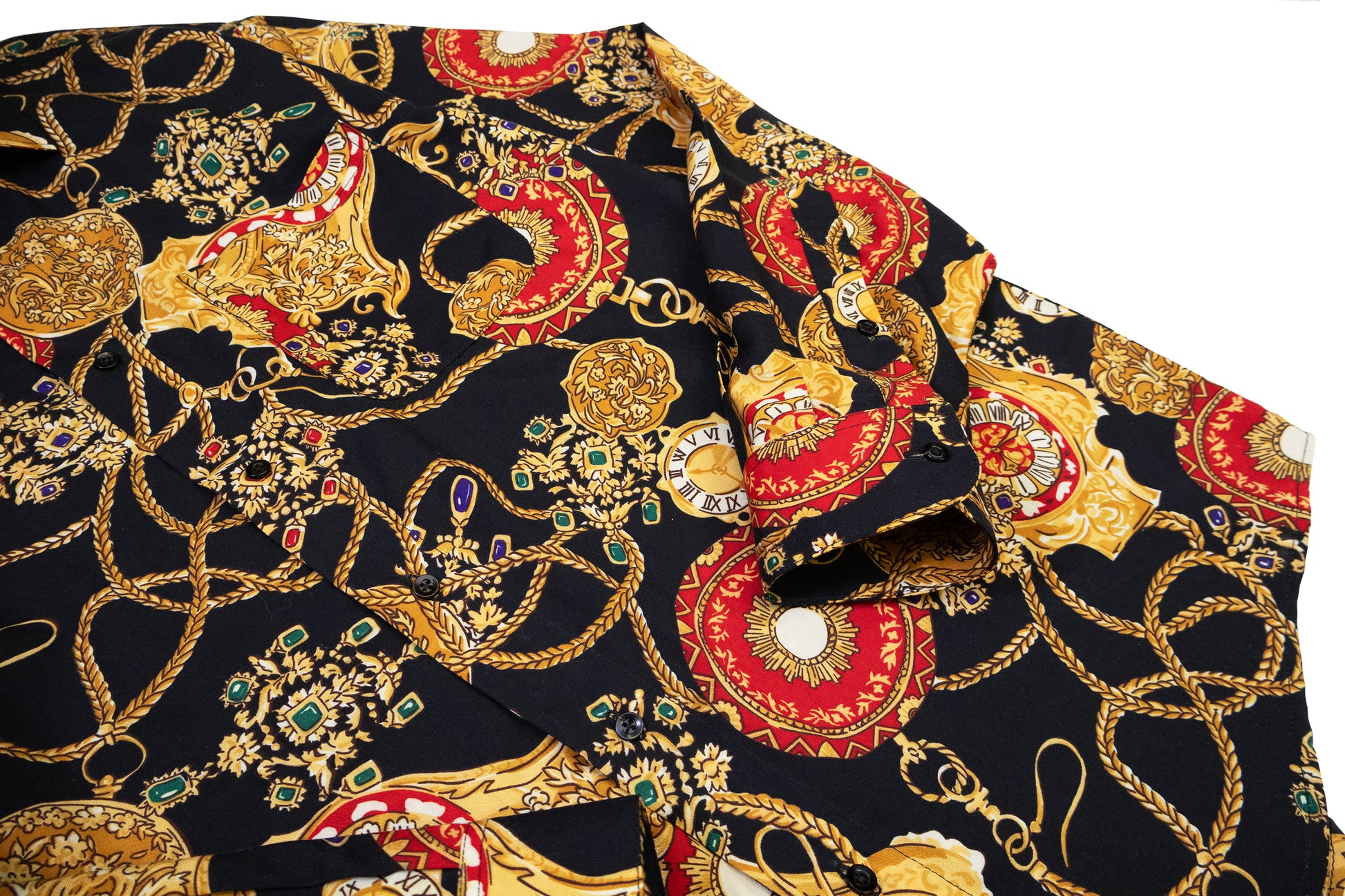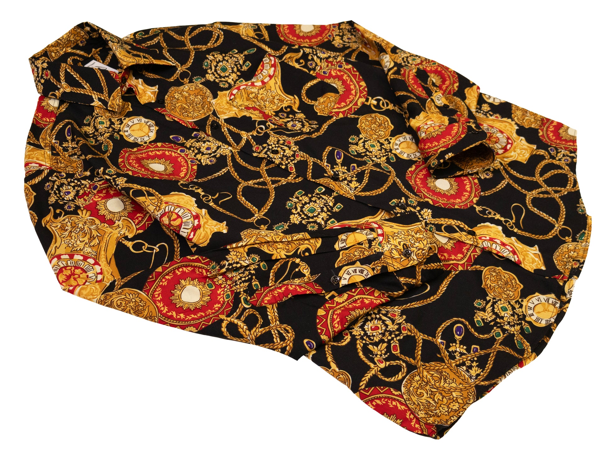 rayon blend. all over pattern of gold chains, clock faces and gems.