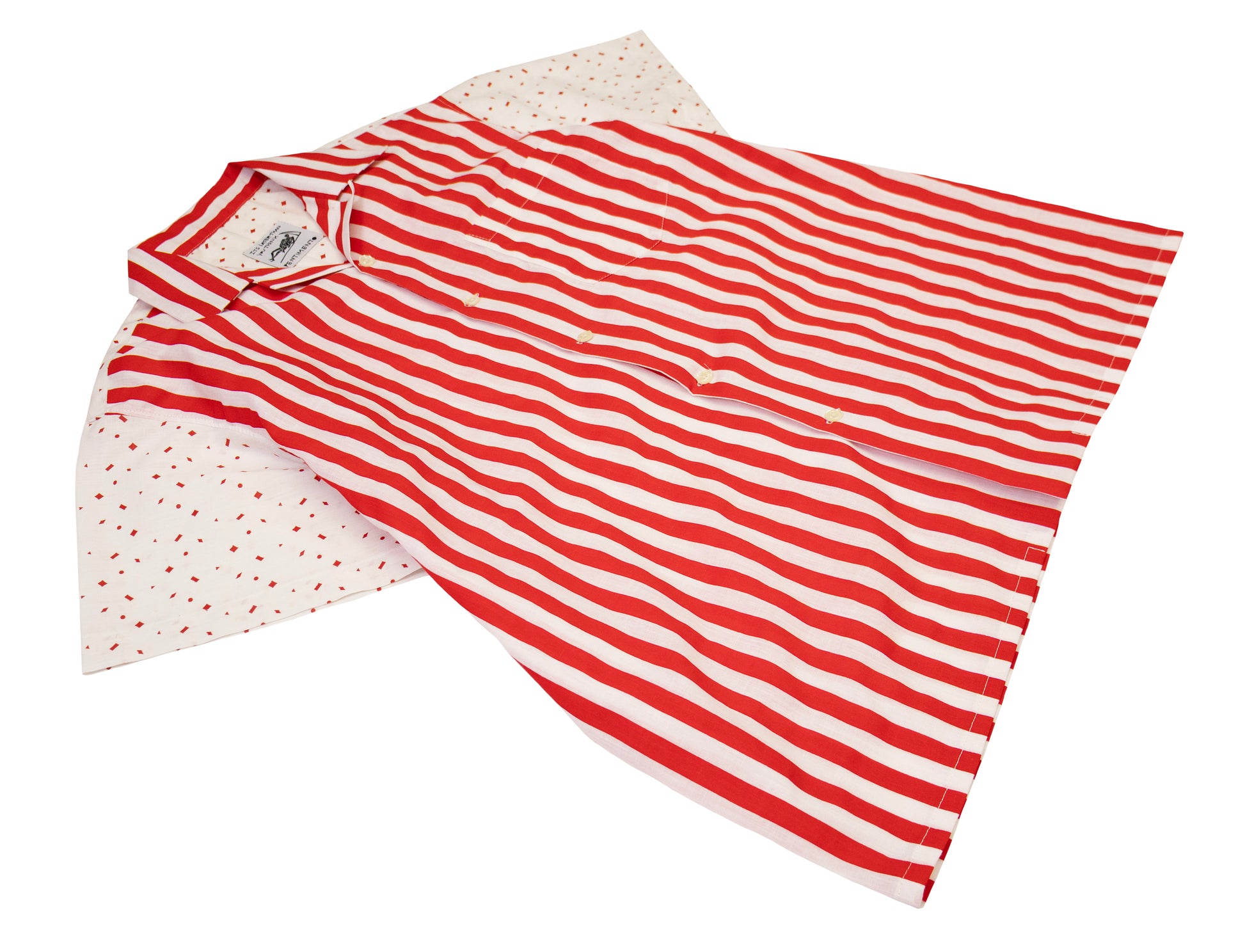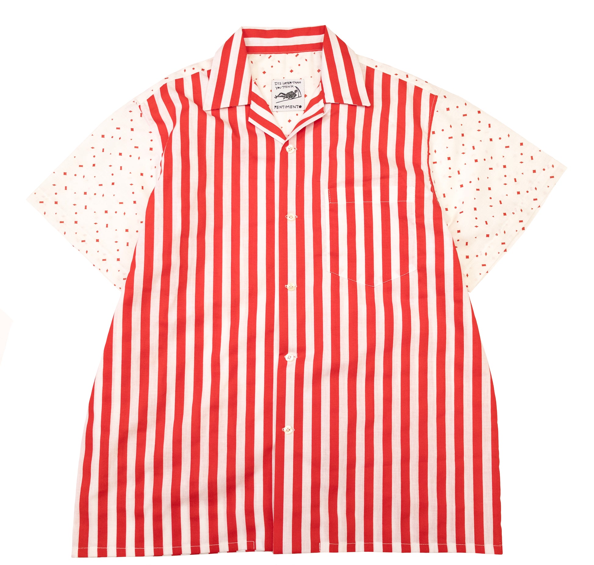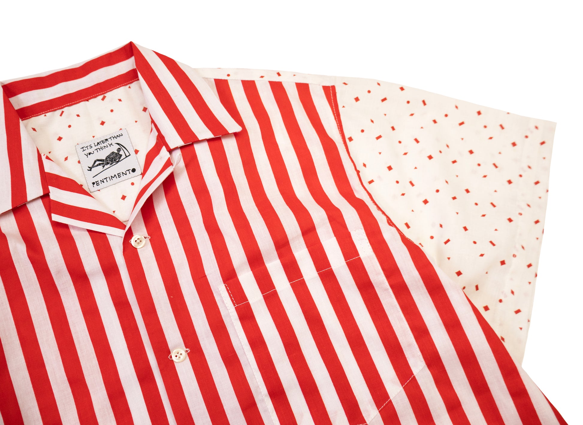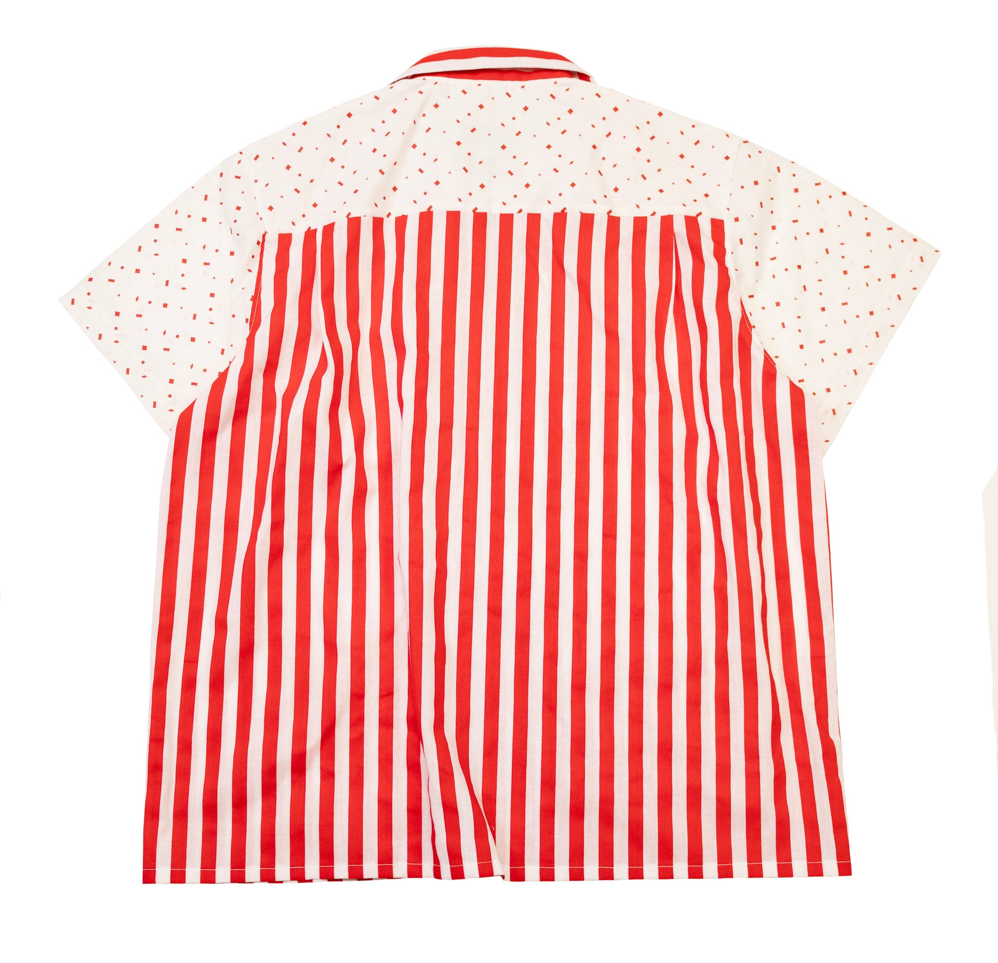 sleeves and yoke made of a 60s print of random specs and shapes. body is 80s cotton stripes. loop collar. fits like a large.