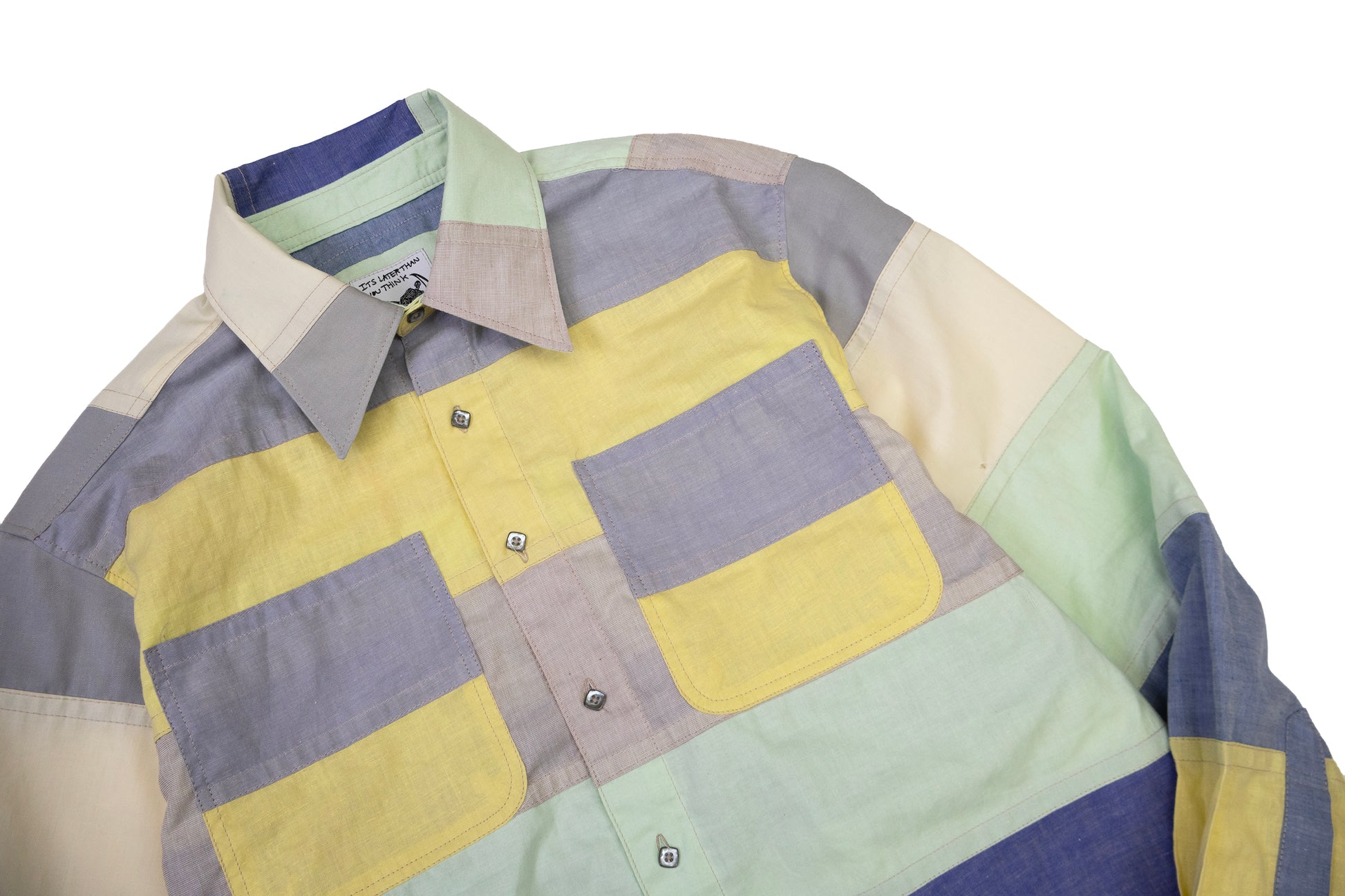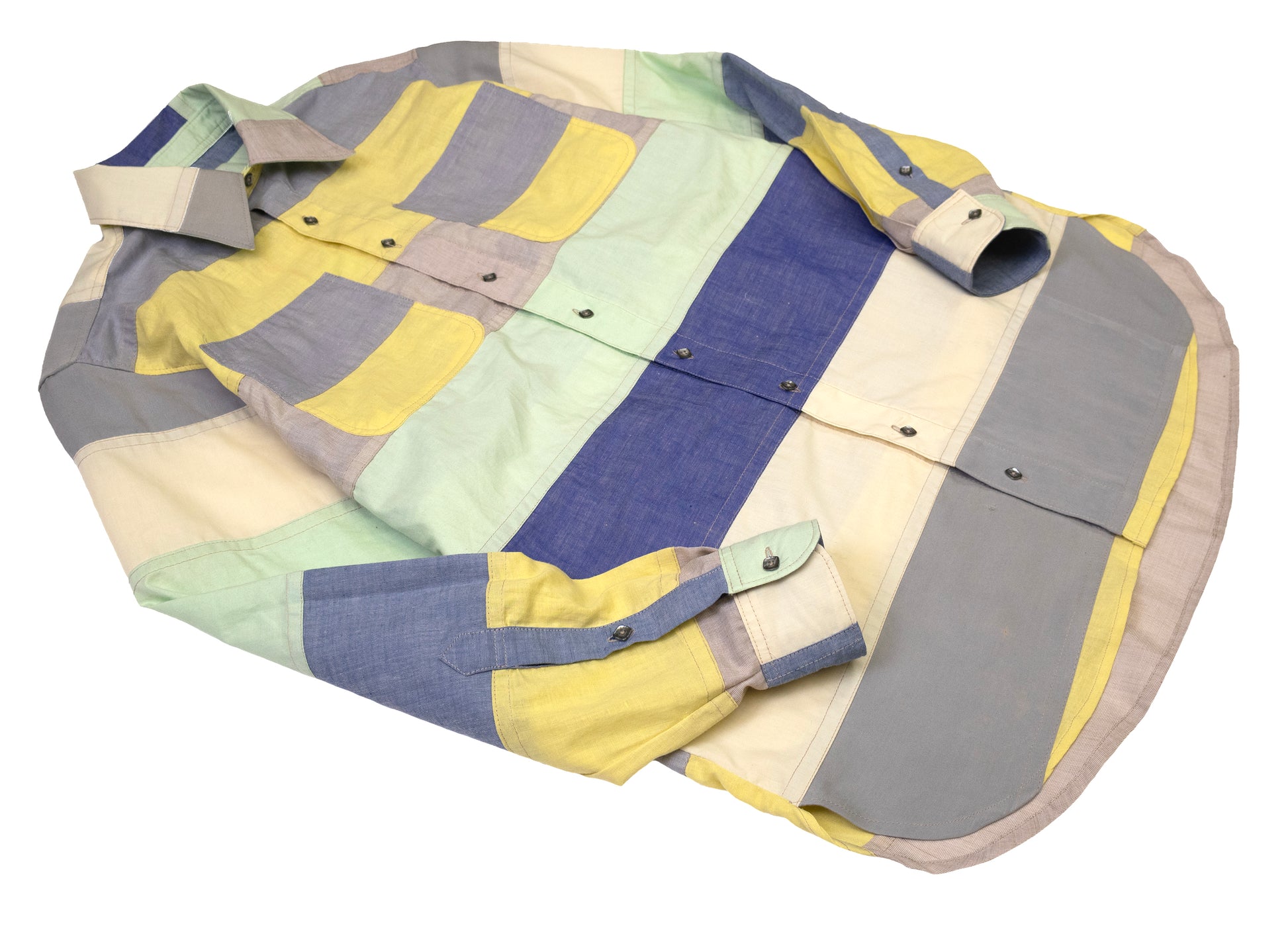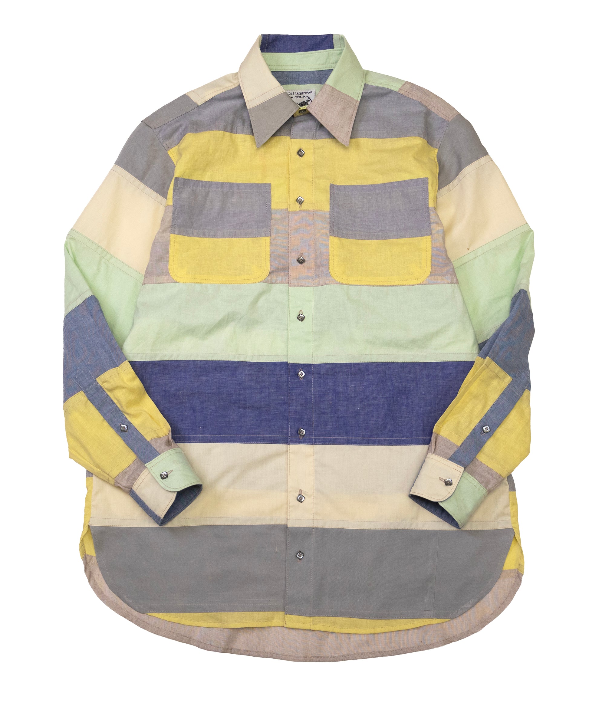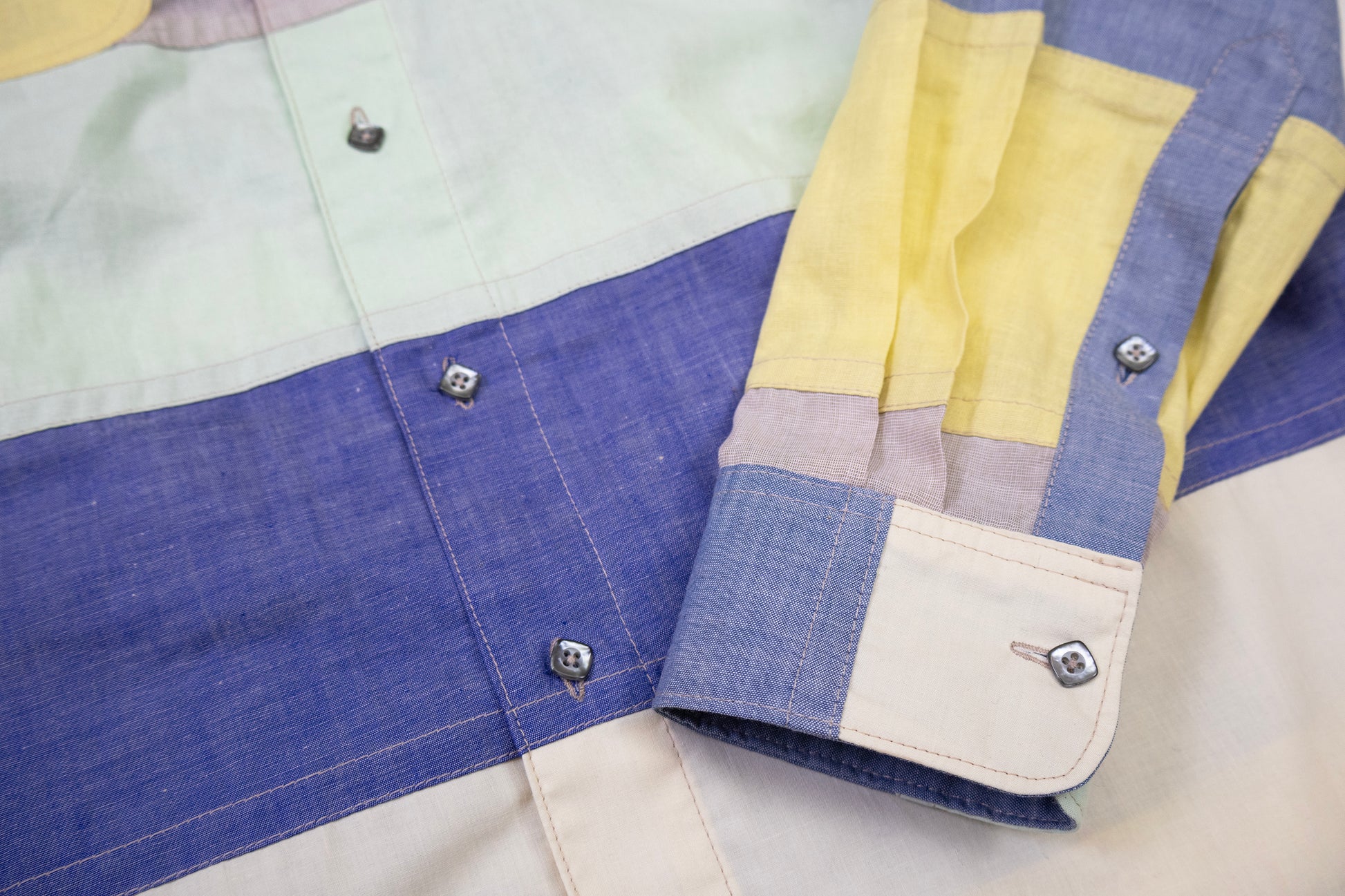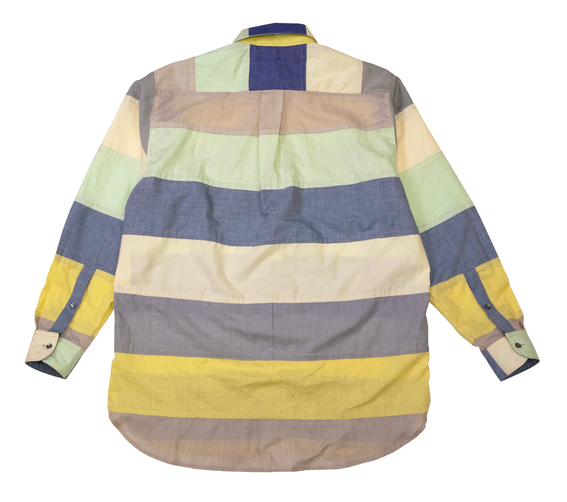 scraps of vintage cotton chambray and a single piece of grey rayon. lap seamed into stripes. pleated back. vintage buttons. fits like an XL.